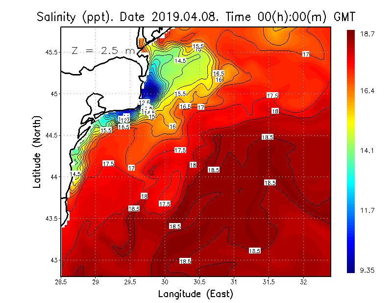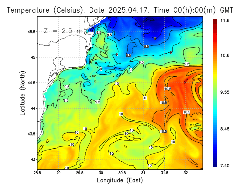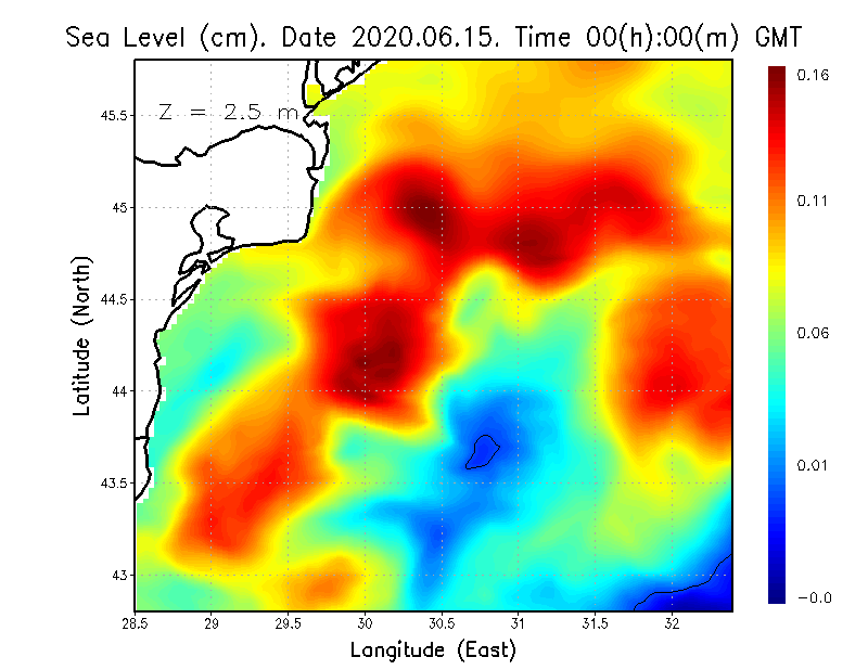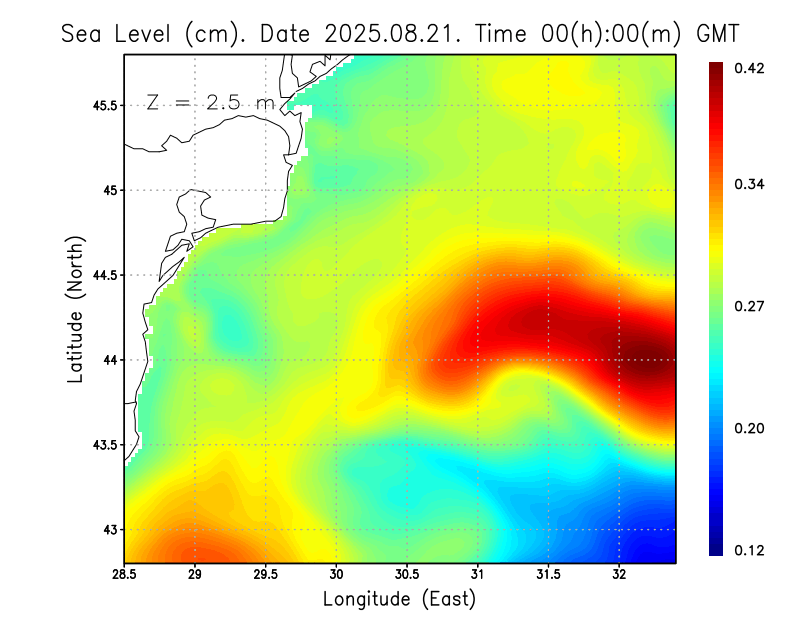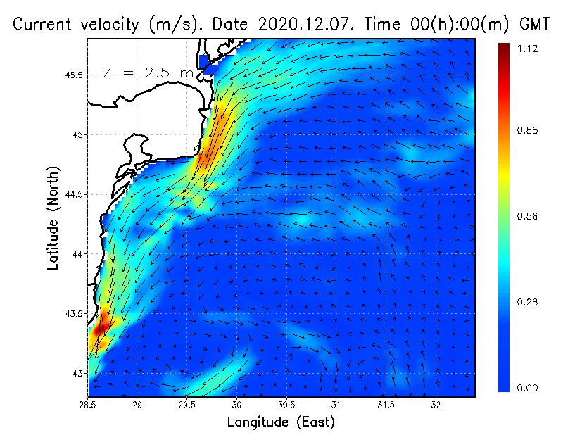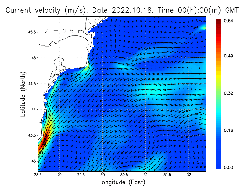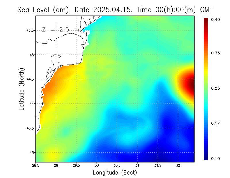 Prognoza oceanografică (-/+ 3 zile) a principalilor parametri de interes (Temperatura apei mării, Salinitatea, Curenţii marini şi Nivelul mării) preluată de la Seviciul European Marin Copernicus (CMEMS), prin metode automatizate şi reprezentare vizuală a datelor de model al Marii Negre, pentru zona de şelf romanesc